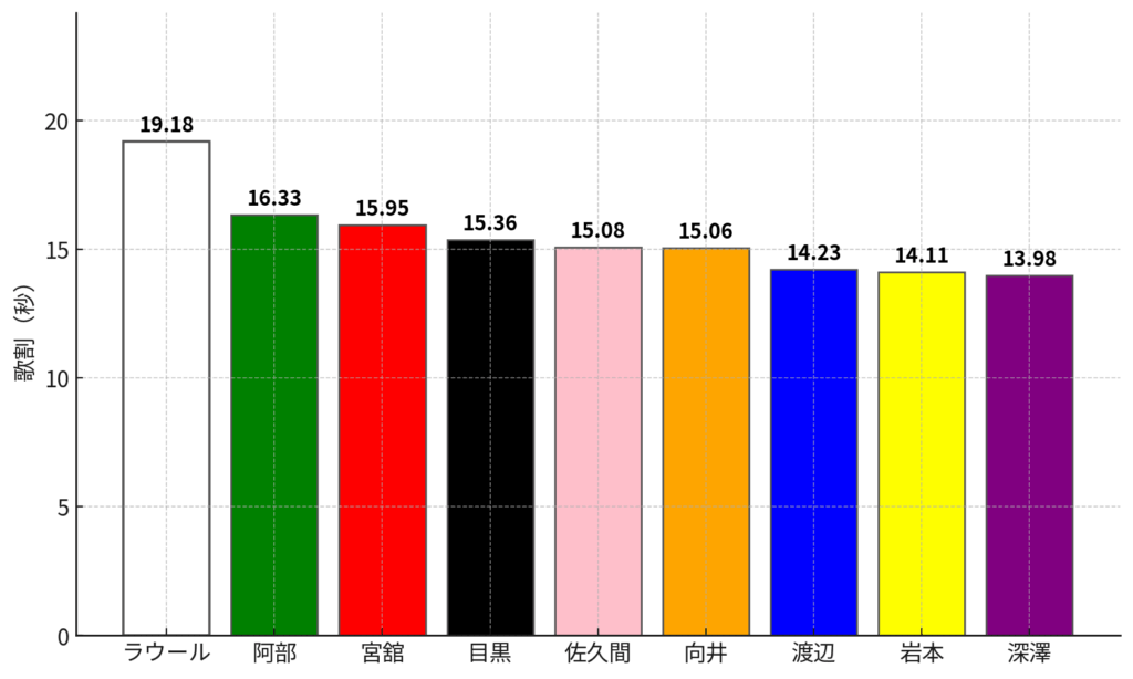 全員で歌う⛄パートを除く、個人パートのみの歌割秒数は以下のようになりました。