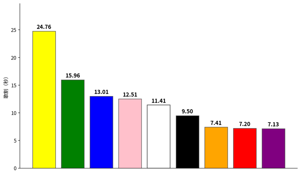 全員で歌う⛄パートを除く、個人パートのみの歌割秒数は以下のようになりました。