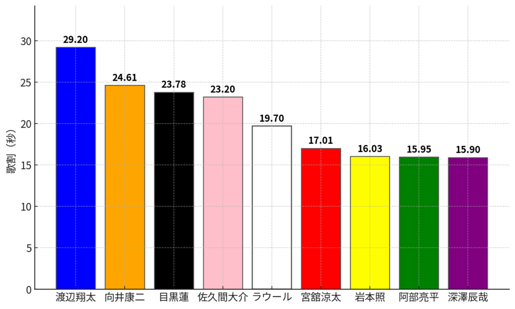 全員で歌うサビパートを除く、個人パートのみの歌割秒数は以下のようになりました。