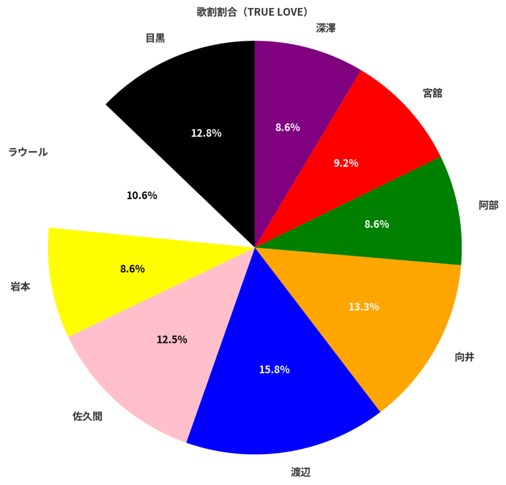 全員で歌うサビパートを除く、個人パートのみの歌割秒数は以下のようになりました。